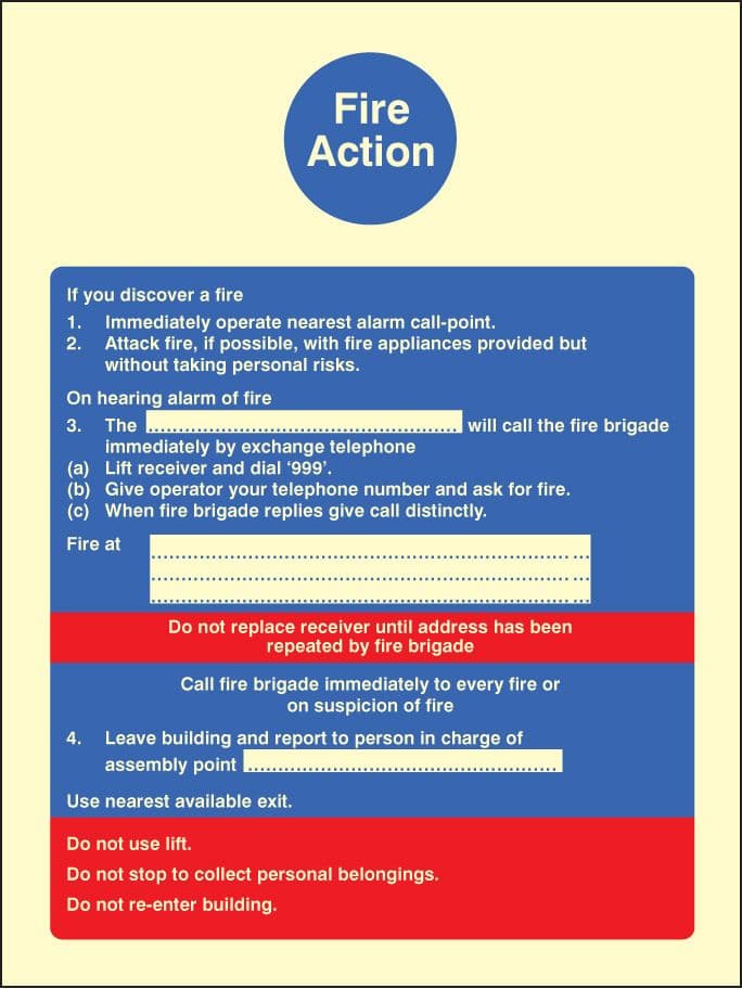 Advise staff and visitors what to do in the event of a fire within the building - provides specific details relevant to the building in question. Material: Photoluminescent Rigid