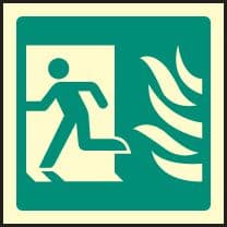 Some hospitals and health services still display fire exit signs with flames (in accordance with the superseded Hospital Technical Memorandum 65). NHS organisations are now expected to comply with the standard ISO 7010 signage. Material: Photoluminescent Rigid