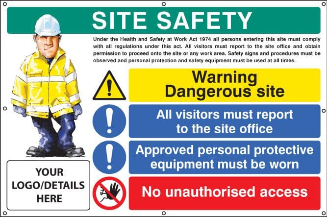 Perfect for site entrance can be easily fixed to fencing with cable ties or bungee ties. Provides key safety messages and advice to site visitors, contractors and members of the public; Lightweight and weatherproof, simply roll away for future use when site closes; Please supply a large high resolution image file of your company logo and any contact details you wish to include when ordering