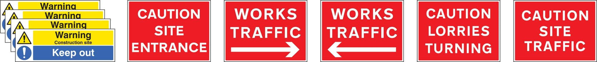 Comprises some of the most commonly used construction signs; Supplied in an easy to store outer wrap; Easy and economical way of purchasing construction site signs; All signs made from 0.9mm rigid plastic