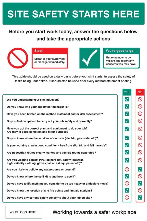 Place at site entrance to remind staff and employees of their checks and questions to ask before going on site; A useful site induction tool; Helps ensure everyone is aware of their responsibilities whilst on site
