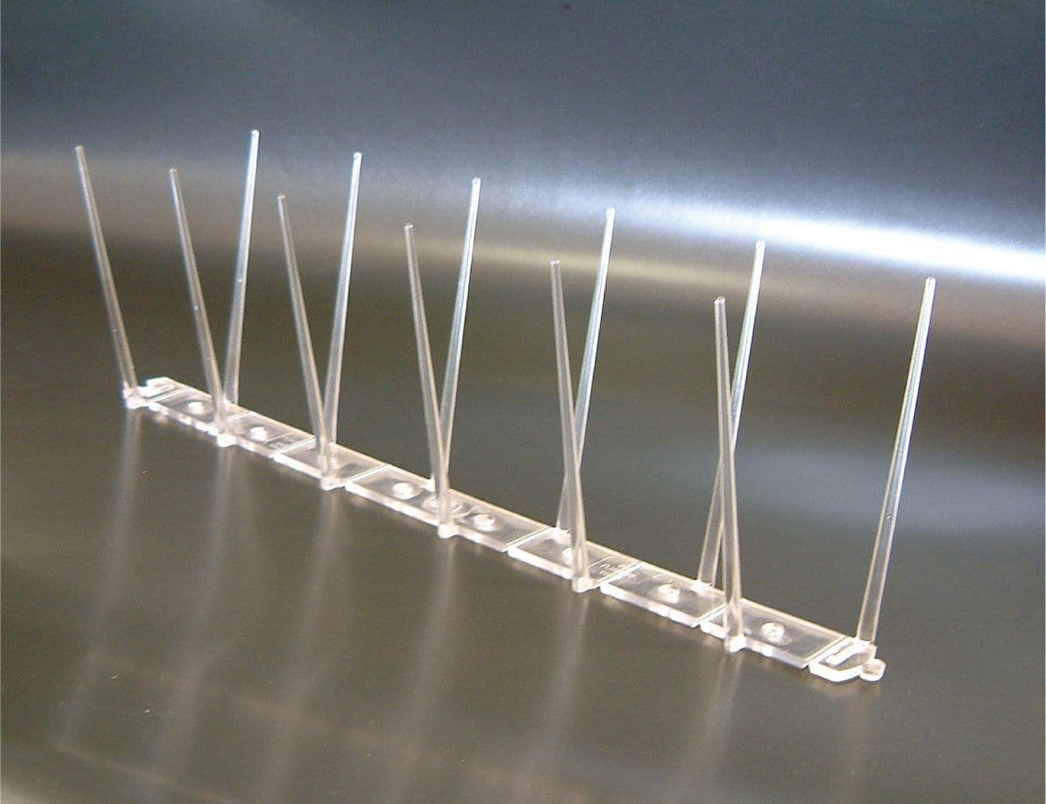 Semi-flexible, round topped (to prevent injury to birds), UV stabilised polycarbonate bayonet spikes, 100mm long set diagonally (providing 90mm height); Spikes 55mm apart but diagonal setting reduces effective gap to 28mm. Spikes are splayed, giving a depth coverage of 90mm; UV stabilised polycarbonate base strips are 333mm long, 20mm wide and 3mm thick; Underside curved to facilitate easy fitting to pipes and roof ridge tiles; "Jigsaw" type connections (male and female) for joining strips together; Slightly curved ends to allow joined strips to follow curves in the receiving surface (e.g. balconies, certain canopies etc.); 8 snap-off grooves to facilitate precise length fitting; 8 holes for screws, rivets or masonry nails; For rapid installation the undersides of the strips can be fitted with optional double-sided tape (code 58105)